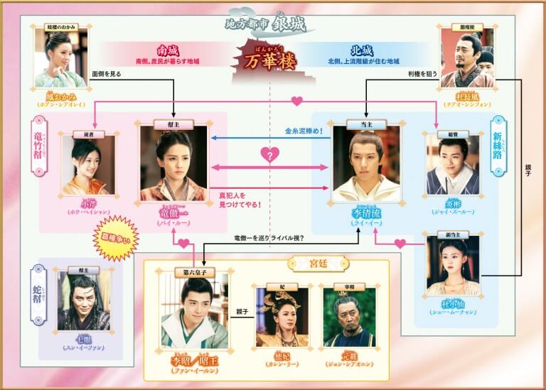 華流ドラマ『万華楼~金糸が紡ぐ運命の恋~』は、江湖の女幇主が商才を開花するサクセスストーリーです。後半は宮中を舞台に、王位継承の陰謀に立ち向かうという、2部構成のラブ史劇となっています。