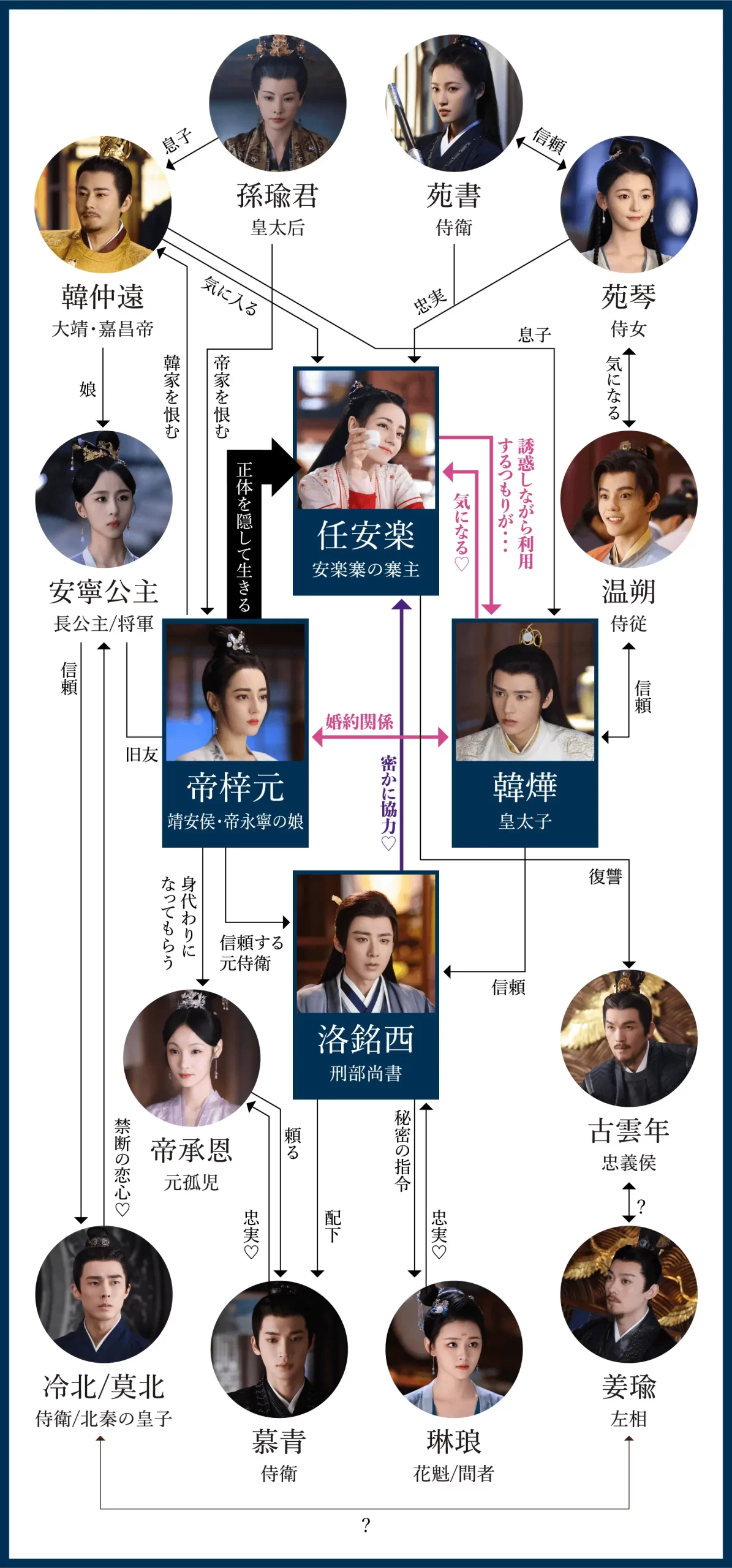 | 安寧公主 (あんねいこうしゅ) | シア・ナン | 韓燁の妹。女将軍。帝梓元の旧友。任安楽と意気投合して姉妹に |